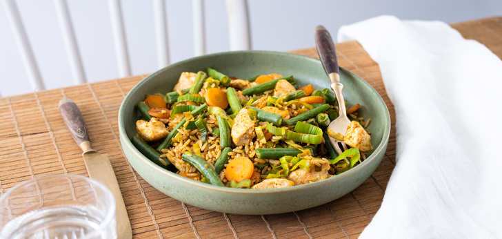 Snijd de sperziebonen in stukjes, de prei in ringen en de wortel in dunne plakjes.