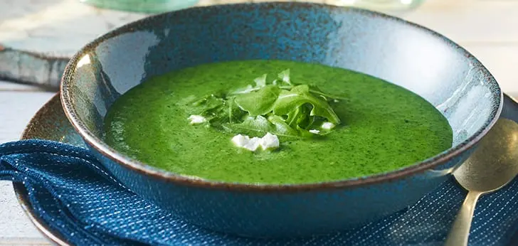Verdeel de soep over 2 borden en garneer met de achtergehouden rucola en wat verkruimelde geitenkaas.
