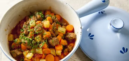 Giet er een scheutje water bij en roer er de tomatenblokjes, aardappelen en wat tijm door. Stoof het vlees en de aardappelen met een deksel op de pan 30 minuten.