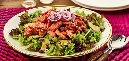 Meng de groente met de de sla en schep de kip erop. Serveer er het brood bij.