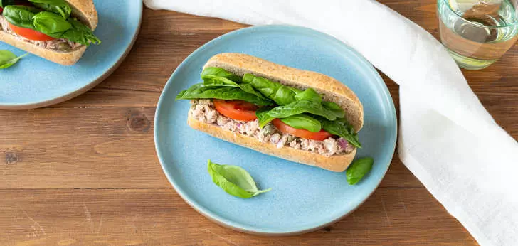 de volkoren broodjes open en beleg met de salade, tomaat, spinazie en basilicum.