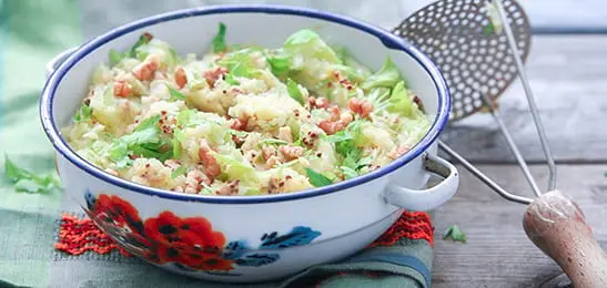 Maak van de aardappelen en groente met de hete melk en de mosterd een puree.