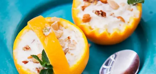 7. Vul de sinaasappelhelften met het kwarkmengsel.