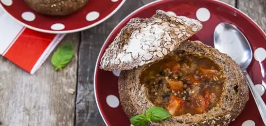 Schep de soep in de uitgeholde broodjes. Strooi er nog een paar blaadjes basilicum over en zet de kapjes van het brood erop.