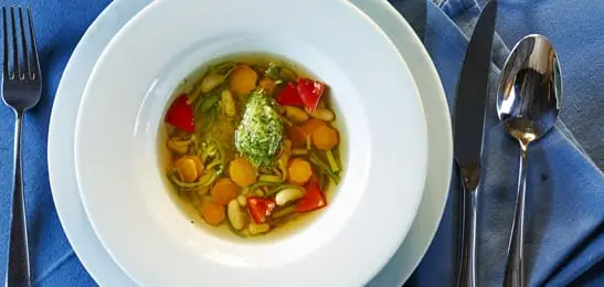 Pureer voor de pistou de schoongemaakte knoflook met de basilicum, de geraspte kaas en de olijfolie.