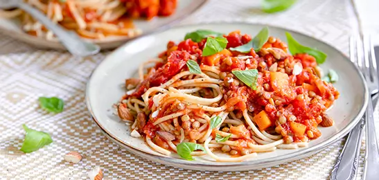 Gebruik in plaats van spaghetti andere volkoren pasta, zoals fusilli, macaroni of penne.