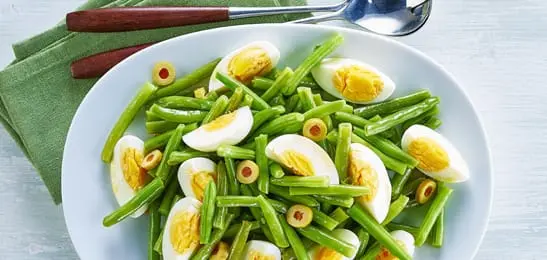 Pel de eieren en snijd ze in parten. Schep de parten ei voorzichtig door de sperziebonen.