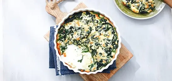 Schep de spinazie en pijnboompitten door het eimengsel en giet over de aardappelpuree.