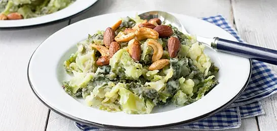 Maak van de gare aardappelen met de hete melk, peper en wat nootmuskaat een puree. Schep de gare kool erdoor.