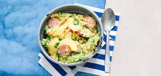 Recept van het Voedingscentrum: Stamppot met raapstelen, worst en gebakken appel