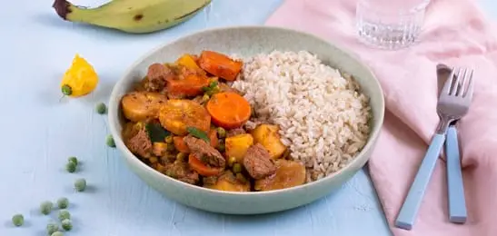 12. Doe de aardappelen, bakbanaan, wortel en doperwten bij het vlees en stoof het geheel in nog 30 minuten verder gaar.