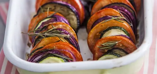 7. Zet om en om de plakjes aubergine, rode ui, courgette en tomaat rechtop in de ovenschaal, zodat je van bovenaf streepjes groenten ziet.