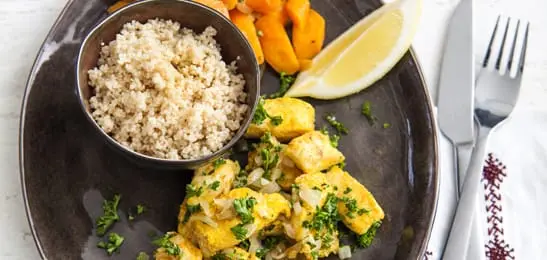 Serveer de vis met de worteltjes en couscous en parten citroen.