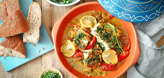 Serveer de tajine met de salade en volkoren (Marokkaans) brood.