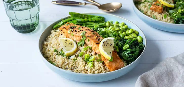 Serveer de zalm met de quinoa en de groente. Strooi de koriander, citroenrasp en sesamzaad erover en garneer met de citroen.