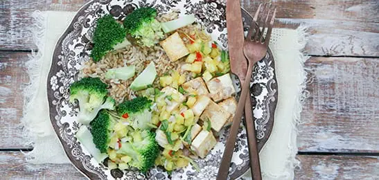 Serveer de ananassalsa, rijst en de broccoli bij de tofu.