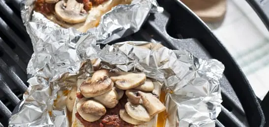 Vouw het aluminiumfolie goed dicht en laat de pakketjes in een grillpan of in een pan met een bodempje water in 10 minuten heet worden.