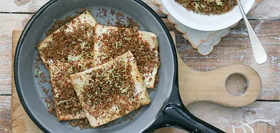Wentel de plakken tofu erdoor en haal ze daarna door het broodkruim.