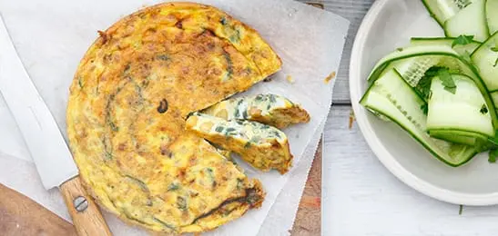 Serveer de tortilla met de komkommersalade en het brood.