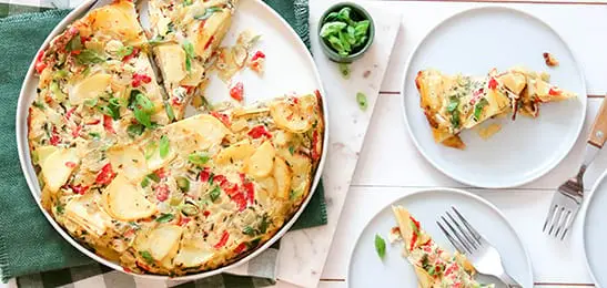 Schenk dit mengsel over de aardappelen en verdeel de ui, de ringen bosui en de reepjes paprika erover. Laat het ei op laag vuur stollen.