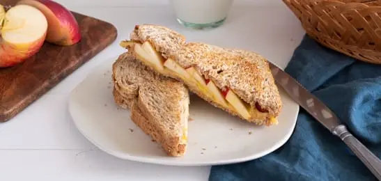 Beleg een boterham met mosterd, kaas en plakjes appel.