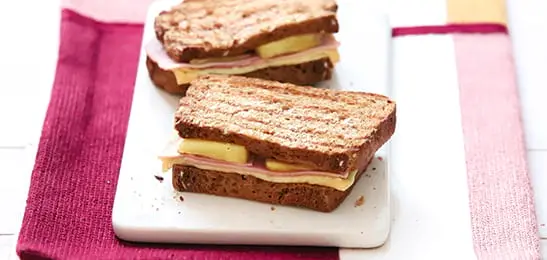 Bak de tosti's lichtbruin in een contactgrill en snijd ze schuin doormidden.