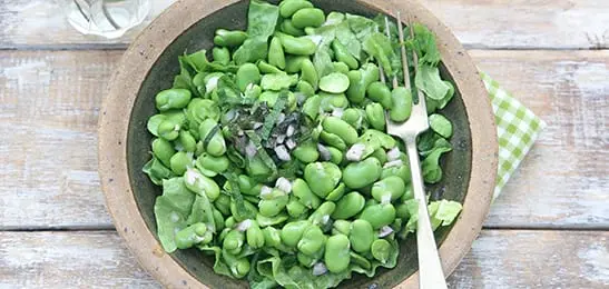 Meng de dressing, de munt en de helft van de sjalot door de nog warme tuinbonen en laat dit afkoelen.