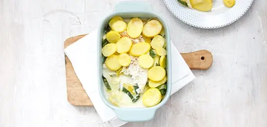 Snijd de aardappelen in plakken en leg de helft in een ovenvaste schaal.
