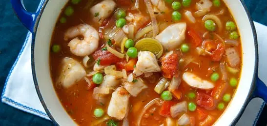 Roer de garnalen en doperwten erdoor. Laat de vis in een paar minuten gaar worden.