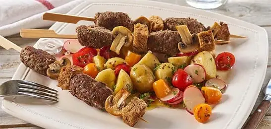 Meng de radijs en tomaatjes door de krieltjes en maak op smaak met nog wat citroensap, peper en peterselie. Geef de salade bij de vleesspiesjes.