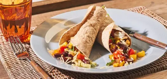 Verdeel het chilimengsel, de sla, kaas en yoghurt over de wraps en rol op.