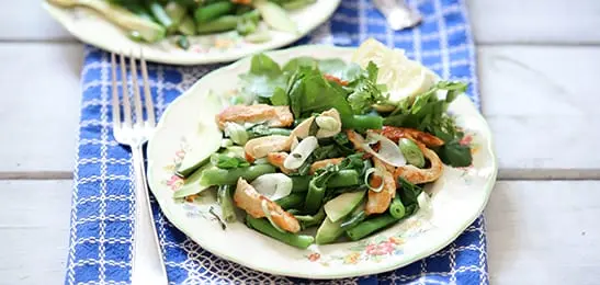 Verdeel de waterkers over 2 borden en leg er de sperziebonen met avocado en kip op.