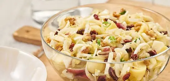 Meng de witlof, rozijnen, druiven, walnoten, bosui en peterselie door de aardappelen.
