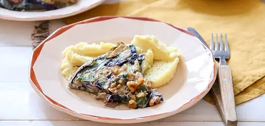 Stamp de aardappelen fijn en maak er met de hete melk, peper en nootmuskaat een puree van.
