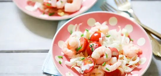 Schep de garnalen erop en garneer met wat bieslook.