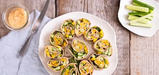 - Smeer de hummus op de helft van de wrap en verdeel wat groentereepjes erover.