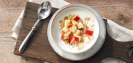 Recept van het Voedingscentrum: Yoghurt met muesli, appel en rozijnen