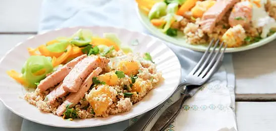 - Serveer de zalm en groente bij de couscous.