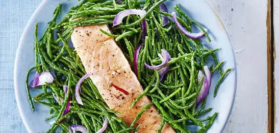 Schuif de groente aan de kant. Leg de mootjes zalm in de pan en stoof de zalm met de zeekraal in ca. 7 minuten gaar.