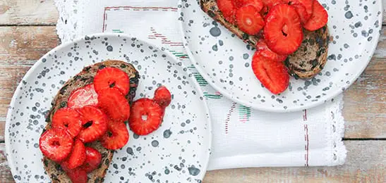 Leg het brood op bordjes en schep de aardbeien erop. Eet warm of koud.