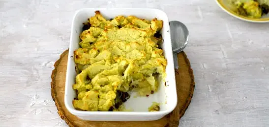 Schep het gehakt op de zuurkool en dek dit af met de aardappelpuree.